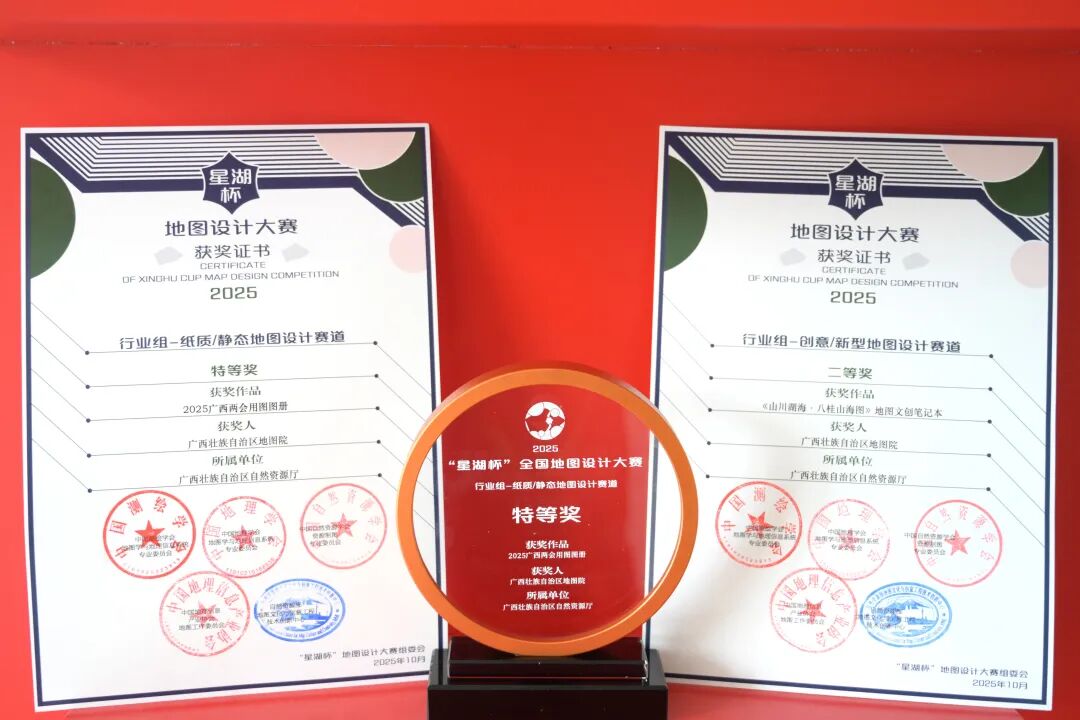 近日,第二届“星湖杯”全国地图设计大赛评选结果公布,广西地图院选送的作品《2025广西两会用图》荣获行业组-纸质/静态地图设计赛道最高奖——特等奖;《山川湖海•八桂山海图地图文创笔记本》获行业组-创意/新型地图设计赛道二等奖。这是该院继摘得国际地图制图协会挂图奖之后,今年在地图编制领域取得的又一重要荣誉。