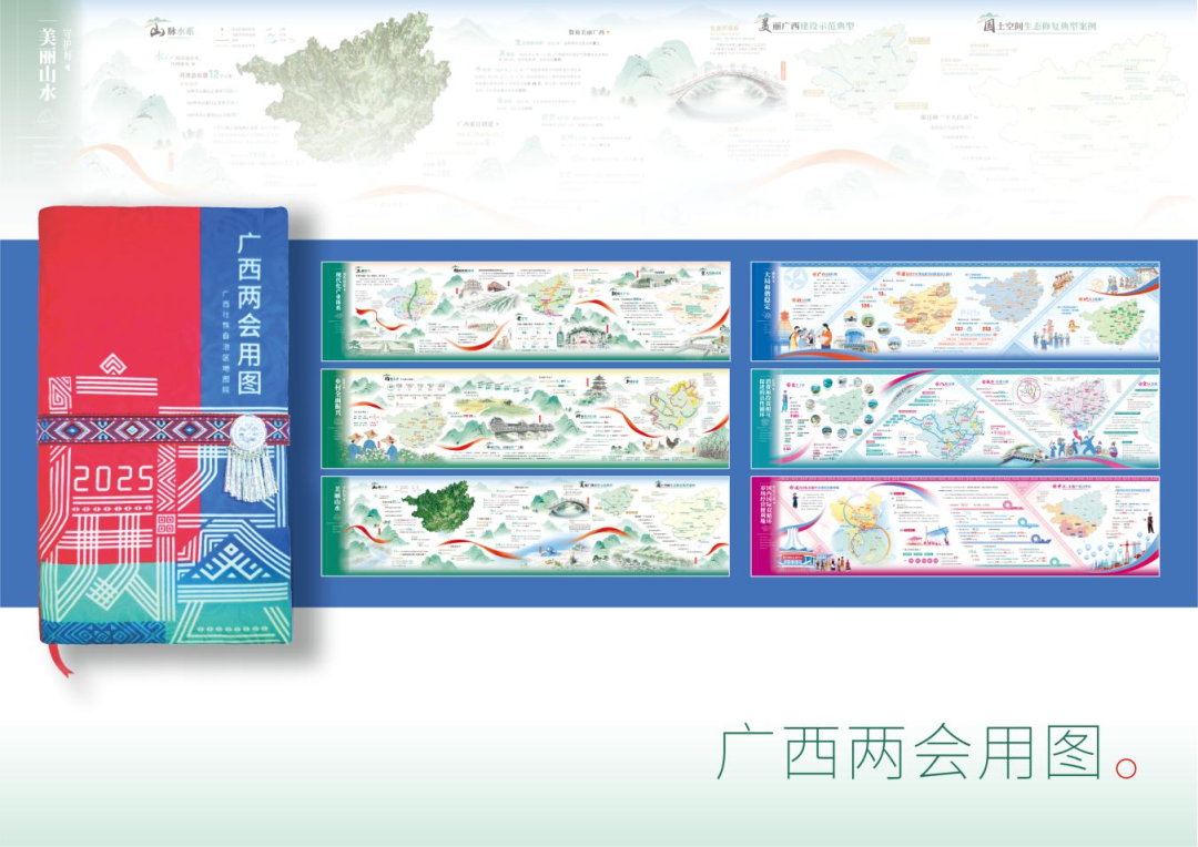 《2025广西两会用图》以“用地图讲好广西两会故事”为核心定位,创新打造出一款集“工具书+政策解读+文化名片”功能于一体的复合型地图产品。结构上,图册构建“八桂山水”与“奋进热土”两大叙事板块,通过17幅专题图和69张场景图片,系统呈现了广西的发展战略与人文风貌。设计上,采用活页装帧与唐卡布材质,从壮布、侗布及民族纹饰中提取色彩元素,融入铜鼓、壮锦、绣球等文化意象,实现政务信息与地域文化的有机融合。整本图册宛如一幅徐徐展开的山水画卷,使读者在了解广西两会、阅读八桂故事的同时,沉浸式畅游于壮美乡景之中。