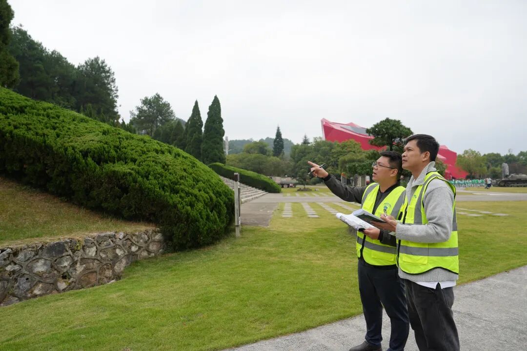 在兴安县红军长征突破湘江烈士纪念碑园,技术人员对红色资源类型及其范围边界开展实地勘查与数据采集。黄葛炎 摄