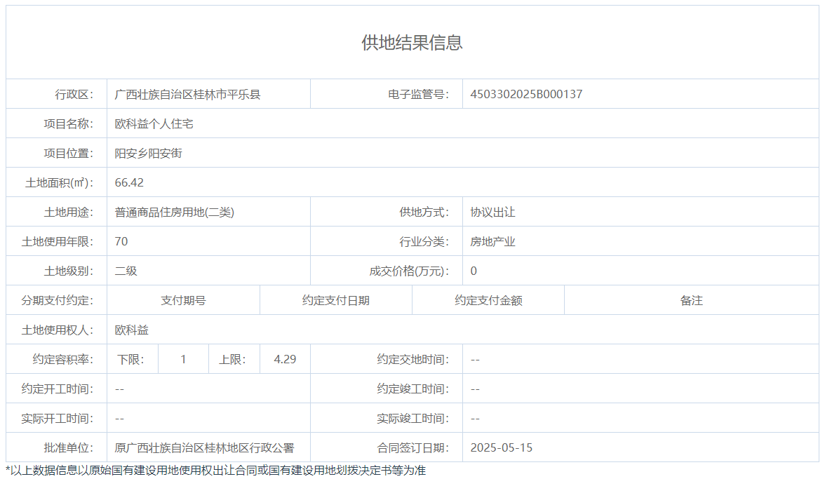 平乐县自然资源局2025年国有土地协议出让供地结果(欧科益个人住宅)